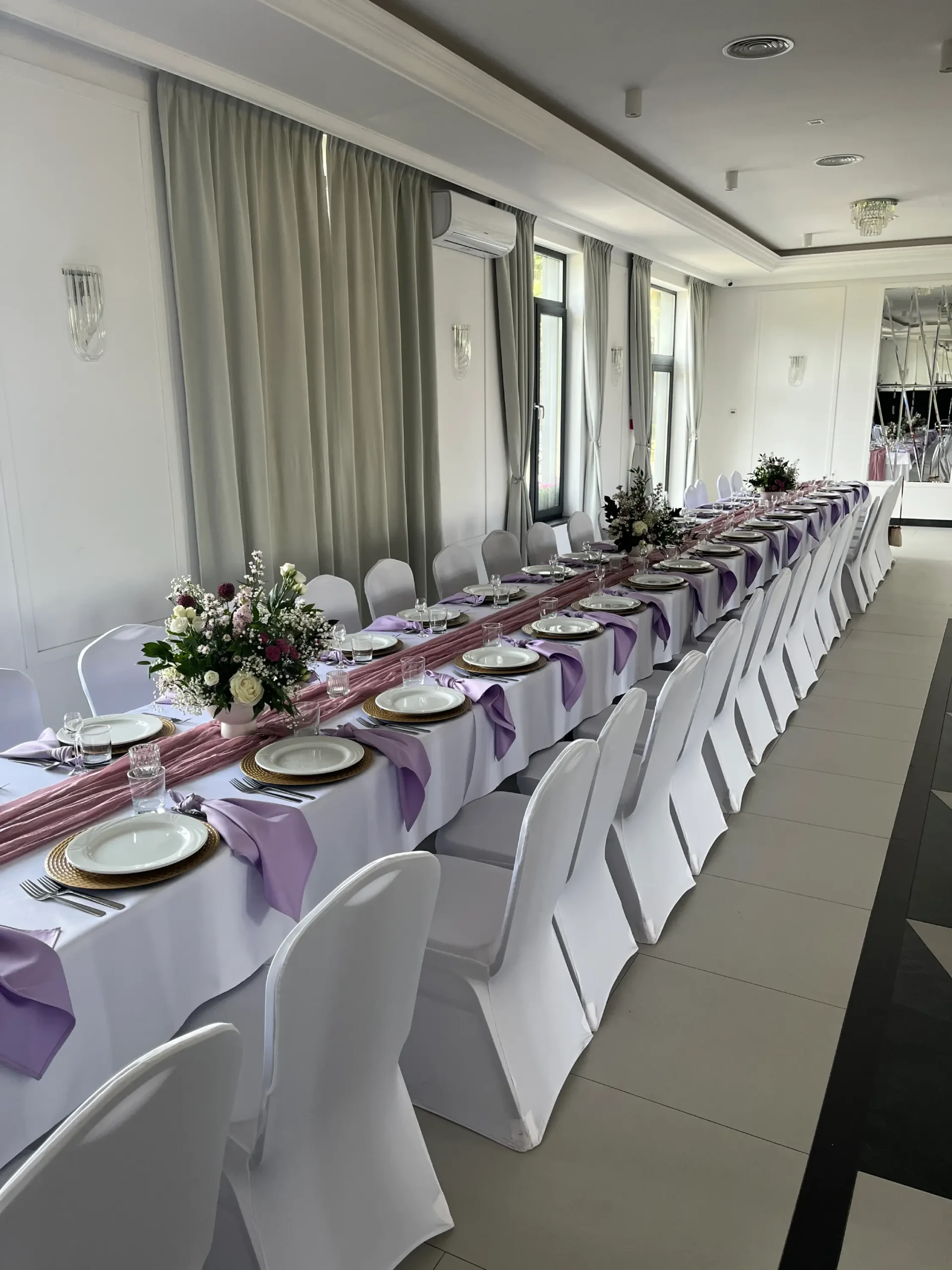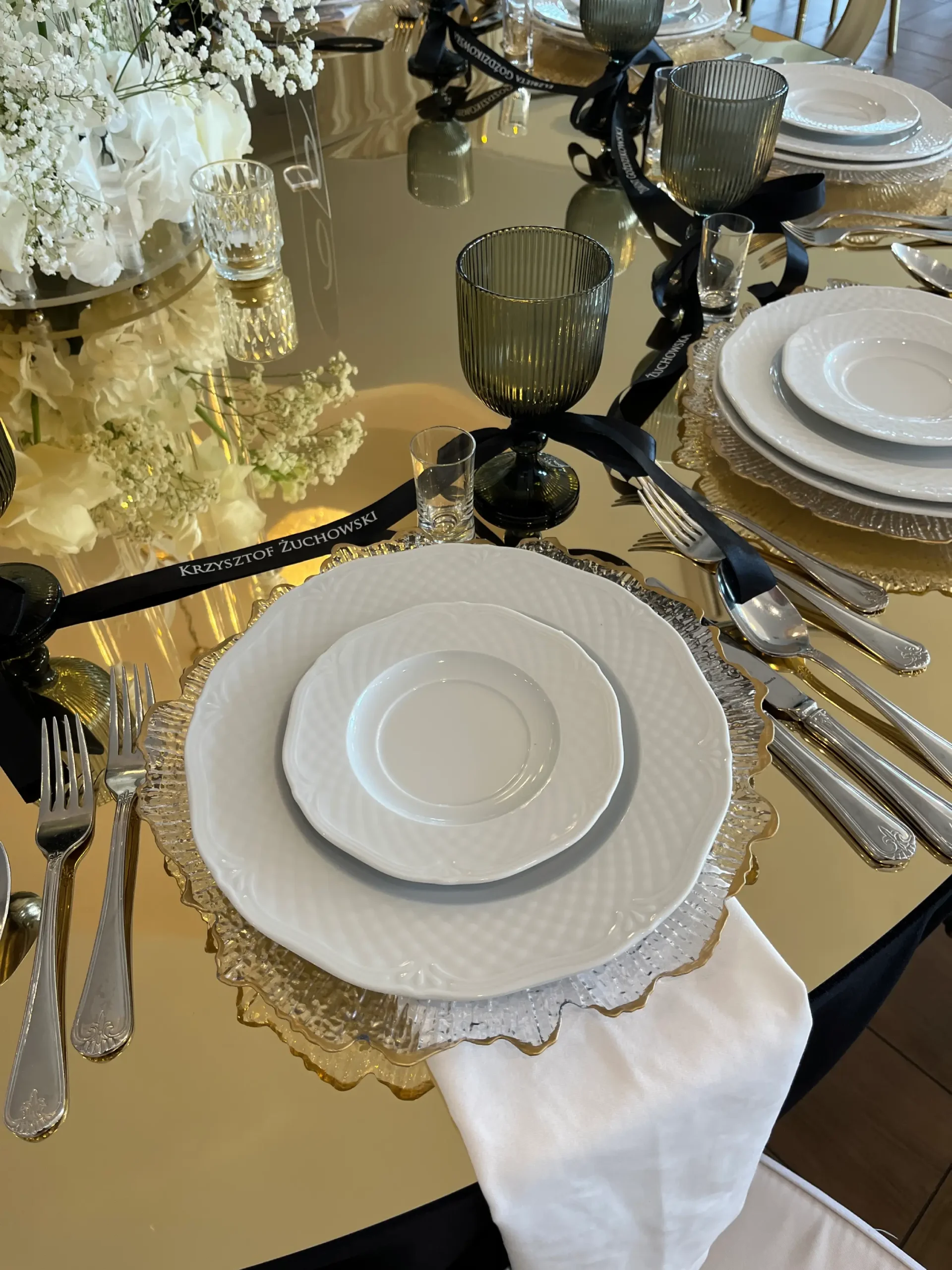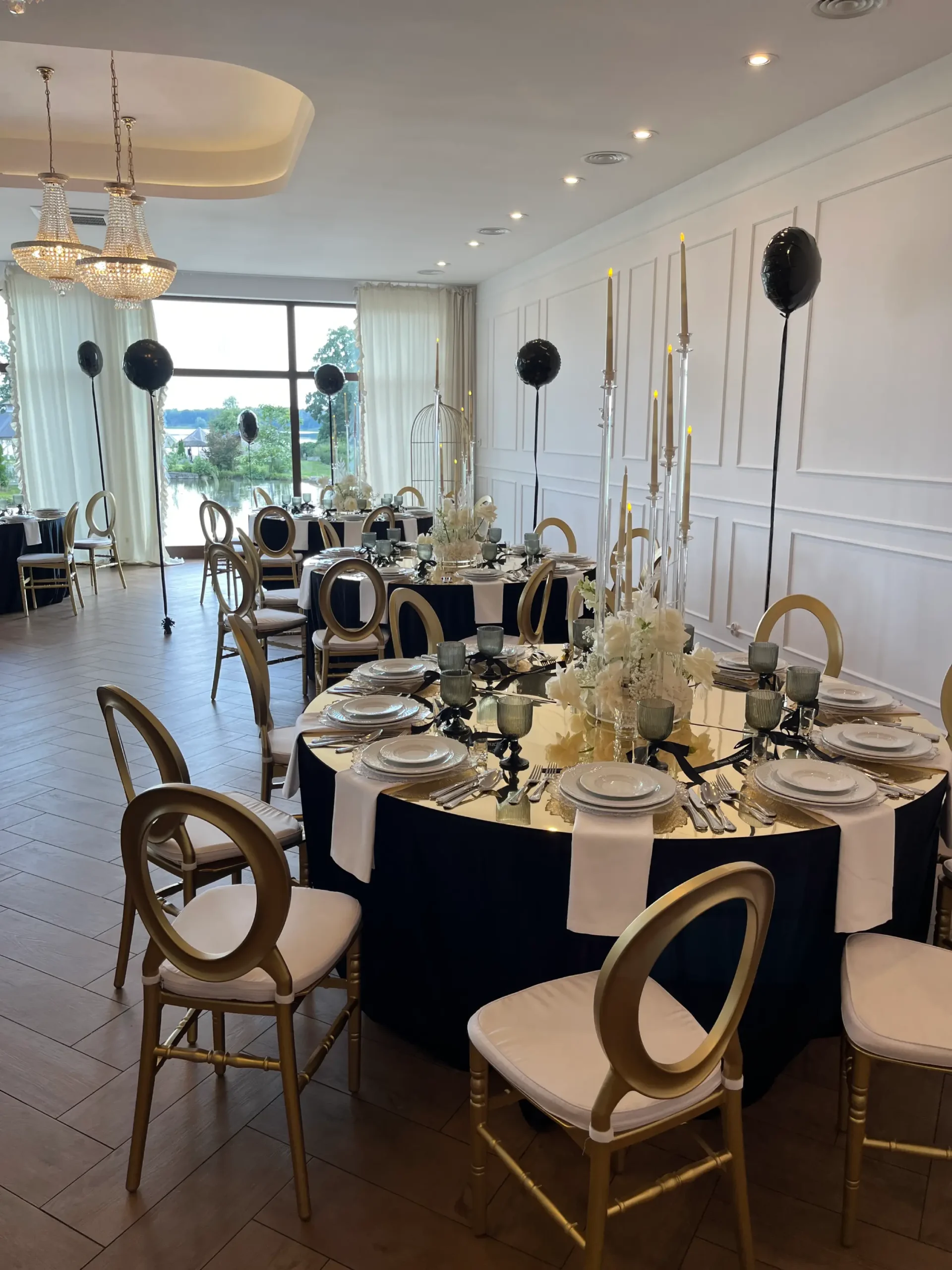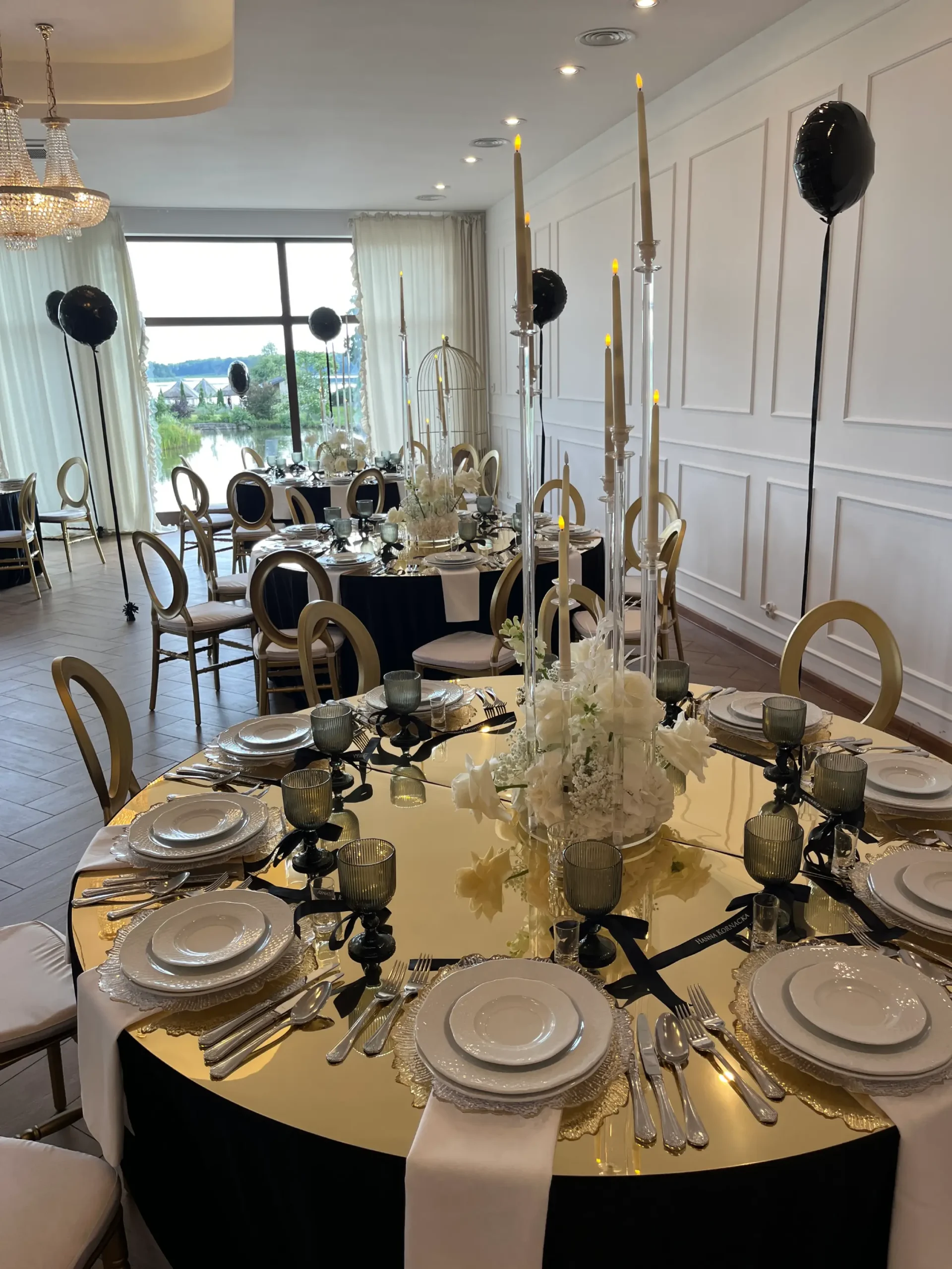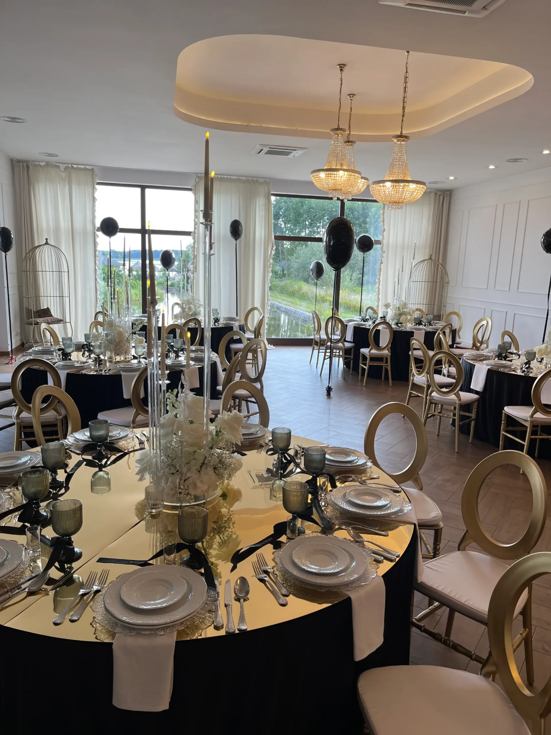 To były wyjątkowe 50. urodziny naszej Klientki, zrealizowane w stylu glamour i odcieniach złota. Impreza odbyła się w Hotelu Przystań w Kikole, gdzie okrągłe stoły i krzesła w złotych akcentach, kryształowe dodatki oraz czarne obrusy stworzyły luksusową, pełną blasku oprawę. Była to wymarzona dekoracja, która idealnie podkreśliła wyjątkowy charakter oraz osobowość naszej Klientki.