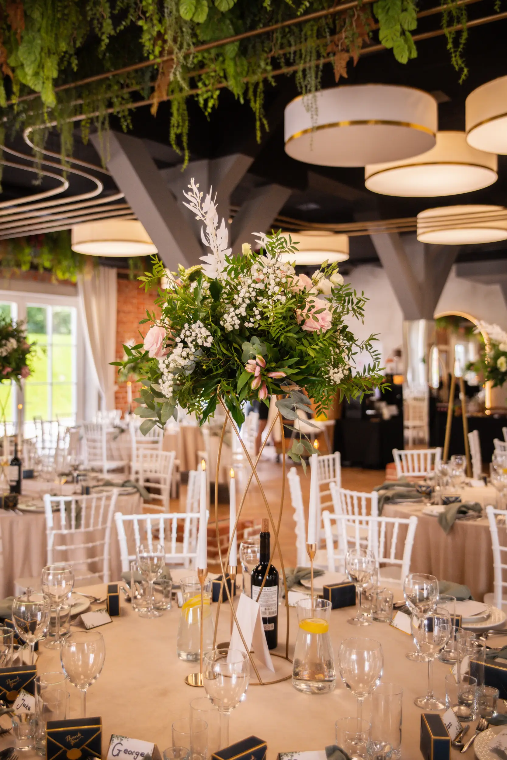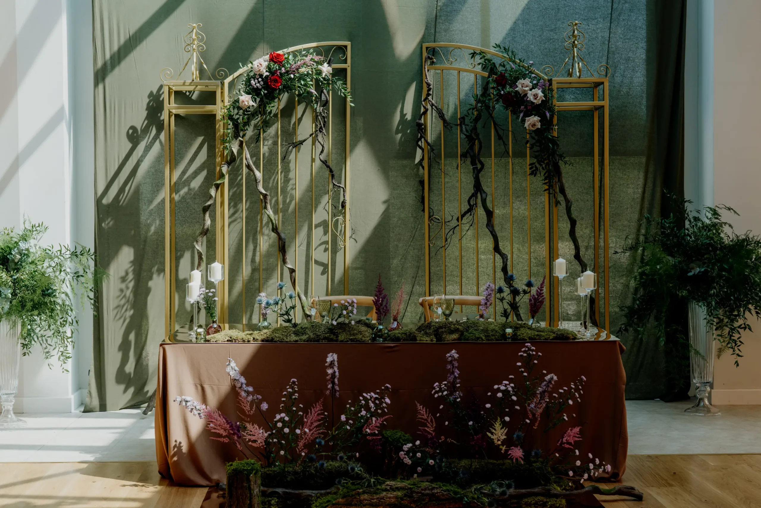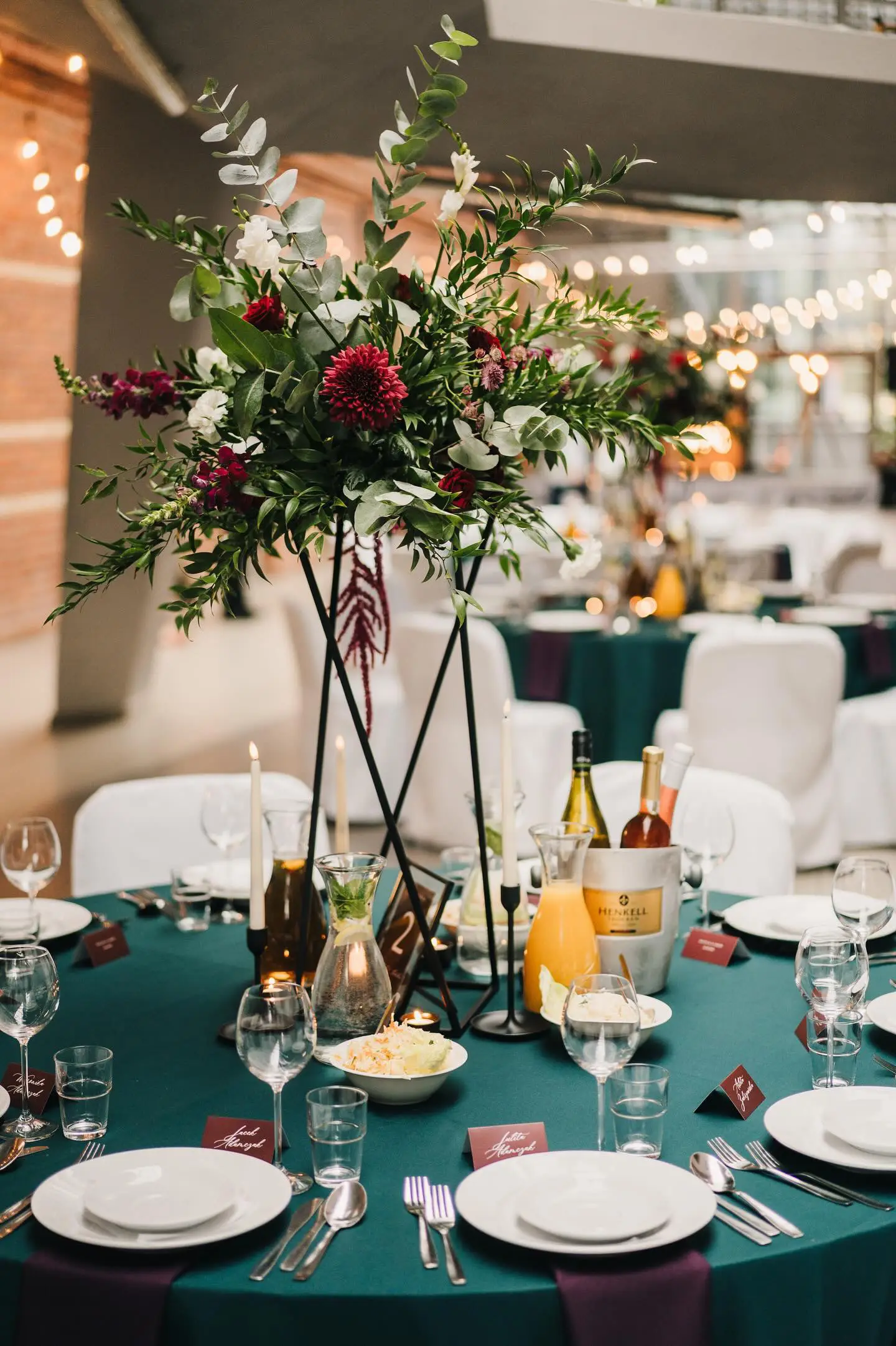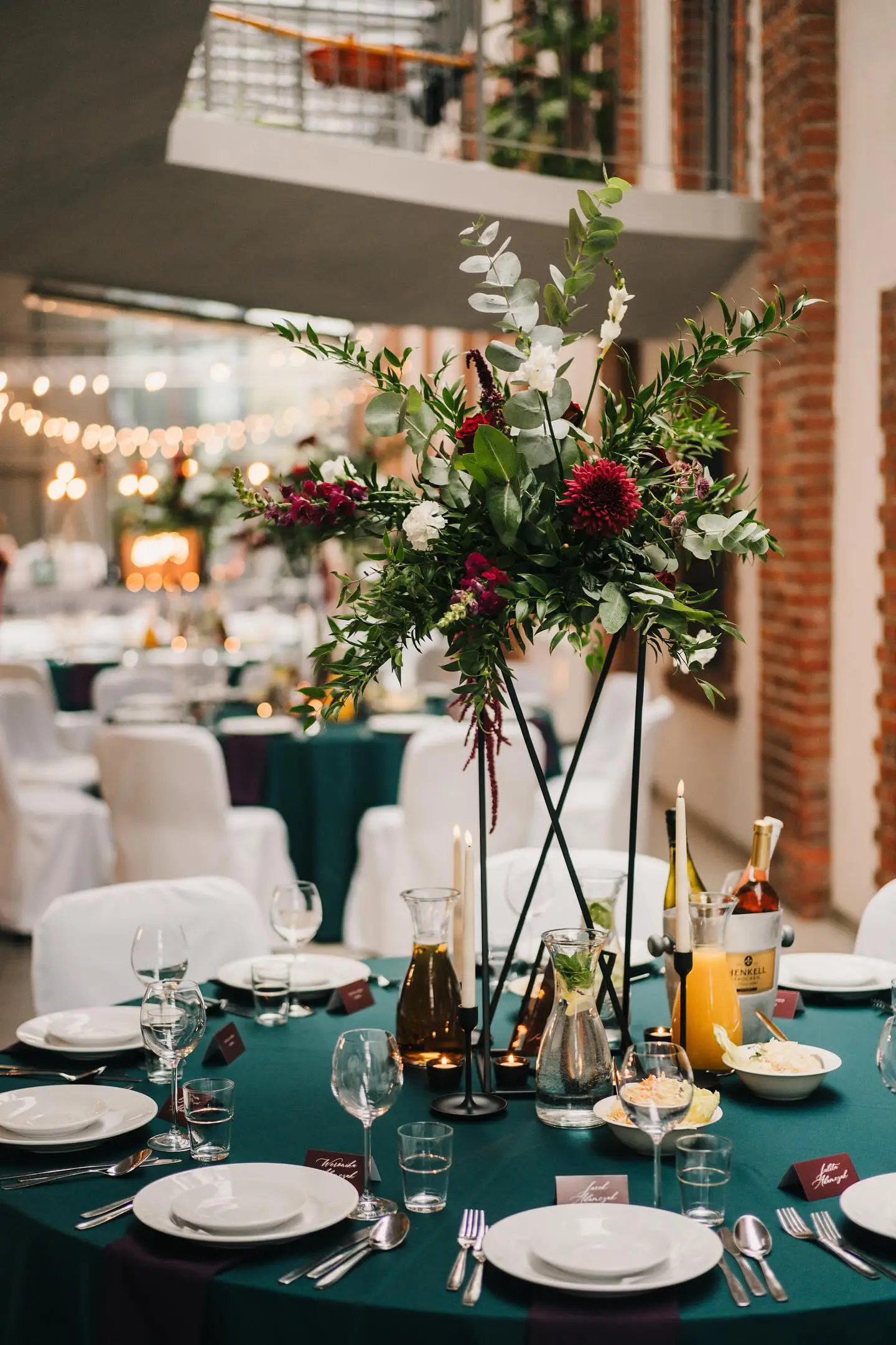 Natalia i Kuba to wyjątkowo kreatywna i artystyczna Para Młoda. Ich wesele w Młynie Smaków utrzymane było w jesiennej palecie zieleni i śliwki. Każdy stół otrzymał nieco inną aranżację kwiatową, co podkreśliło indywidualny charakter dekoracji. Jedne kompozycje swobodnie opadały, inne wznosiły się ku górze, tworząc dynamiczną i niepowtarzalną przestrzeń.