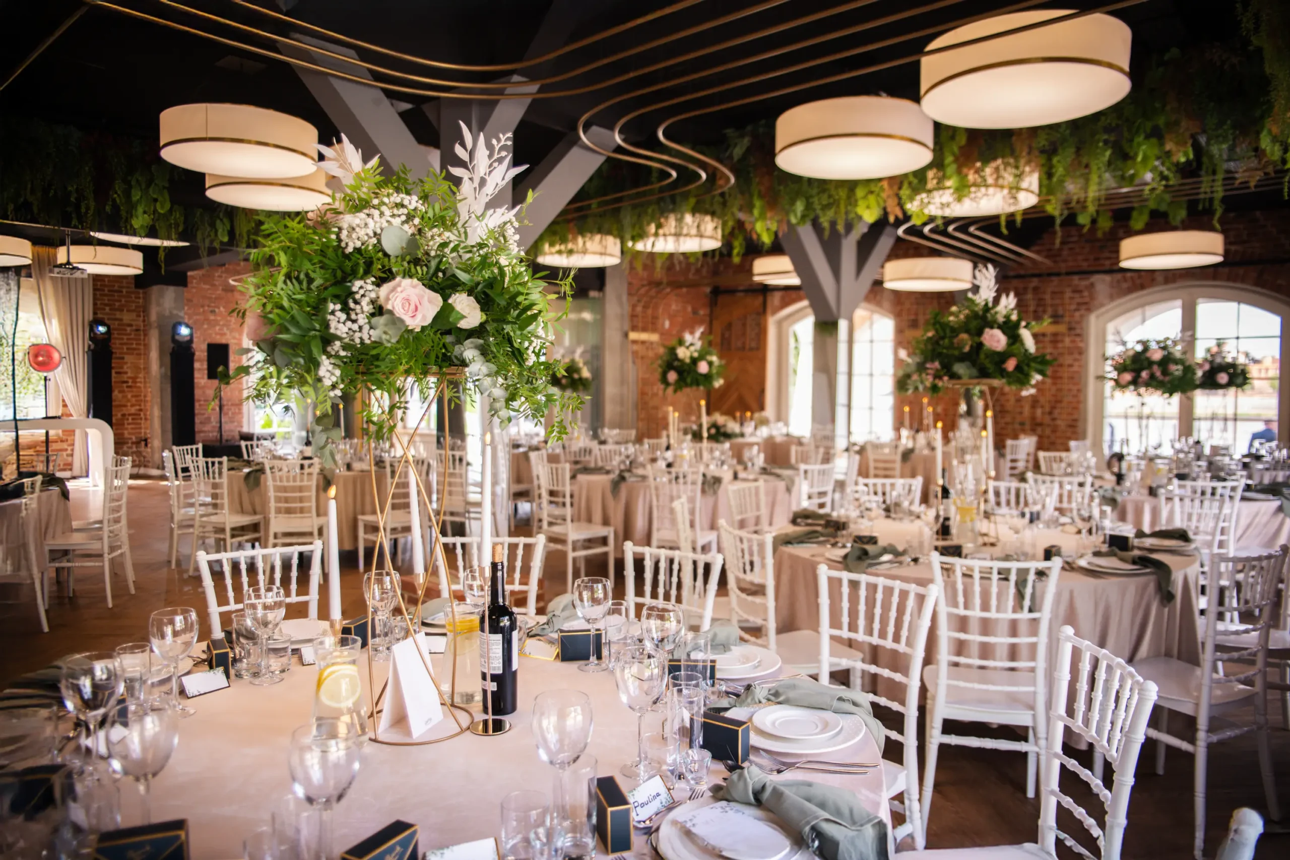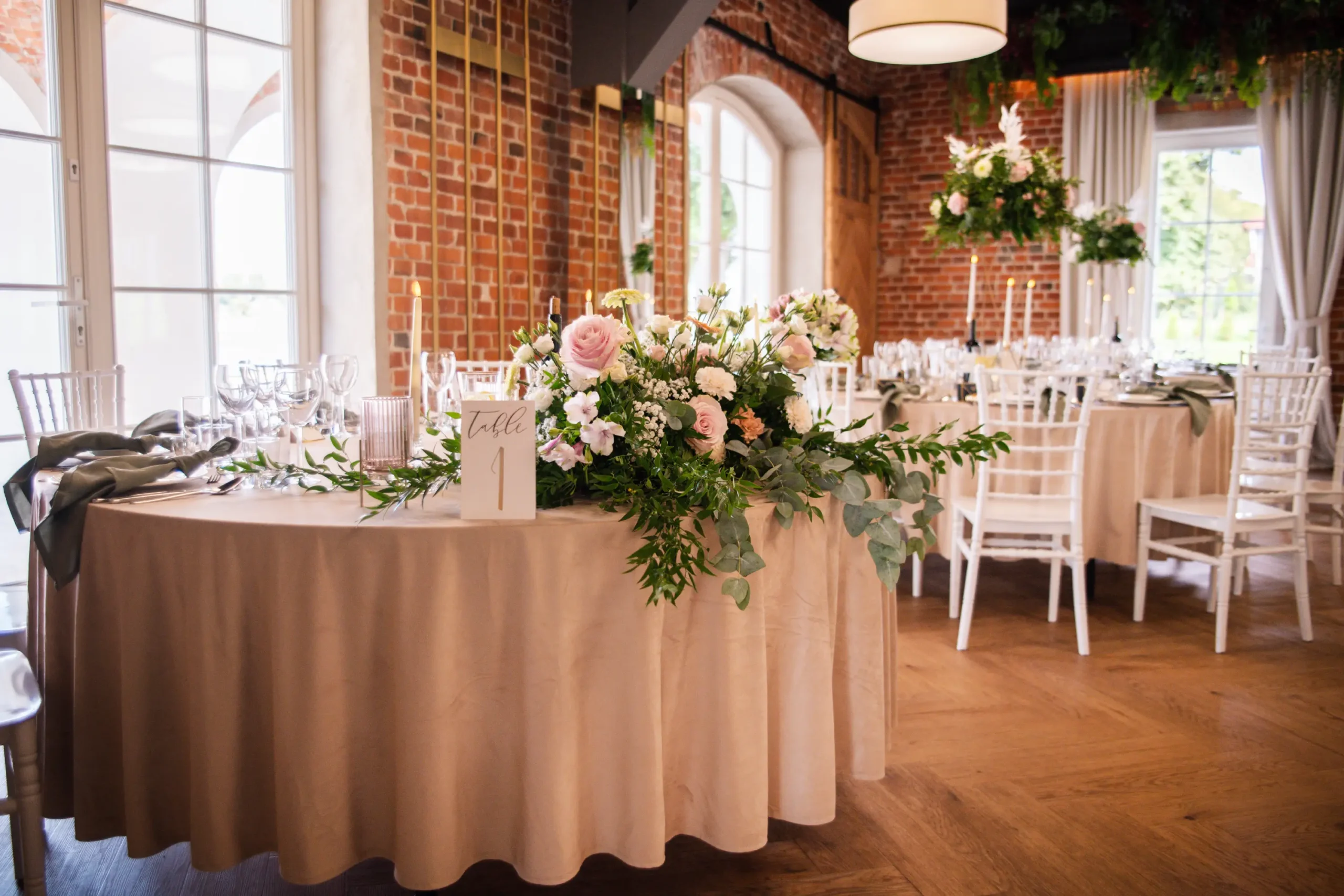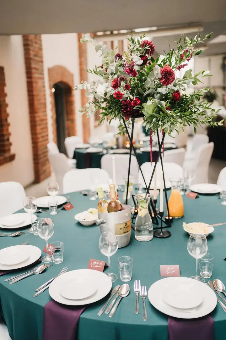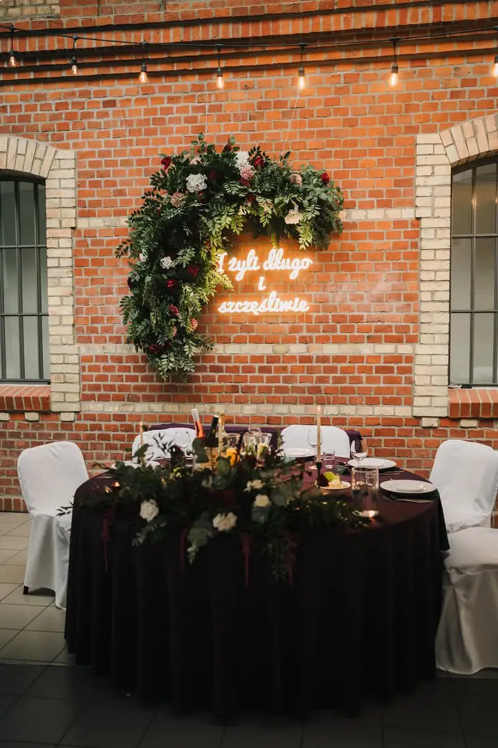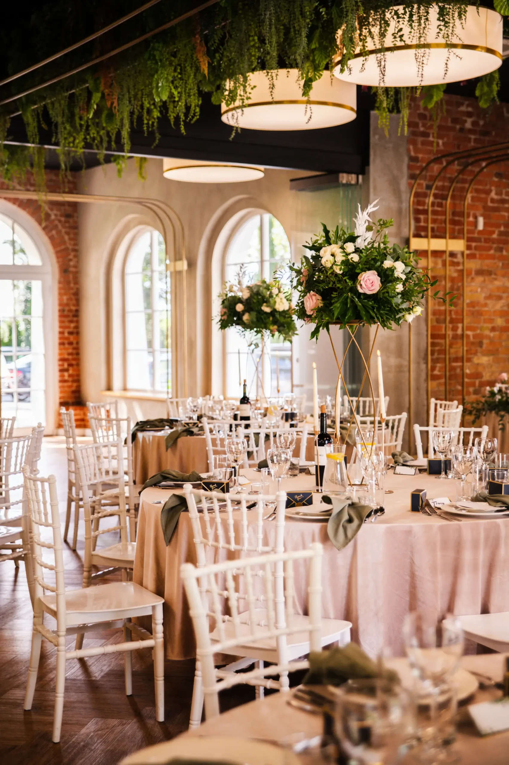 Natalia i Kuba to wyjątkowo kreatywna i artystyczna Para Młoda. Ich wesele w Młynie Smaków utrzymane było w jesiennej palecie zieleni i śliwki. Każdy stół otrzymał nieco inną aranżację kwiatową, co podkreśliło indywidualny charakter dekoracji. Jedne kompozycje swobodnie opadały, inne wznosiły się ku górze, tworząc dynamiczną i niepowtarzalną przestrzeń.