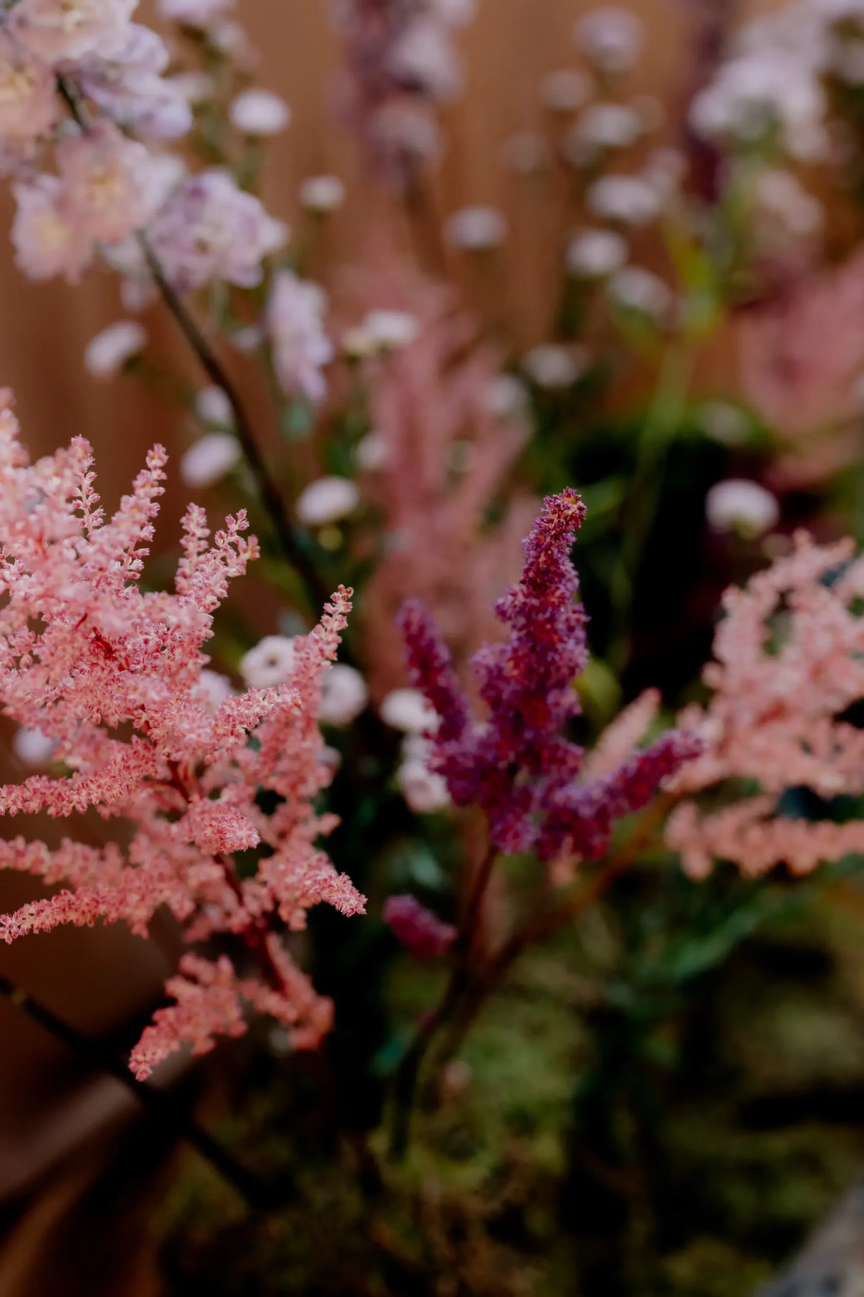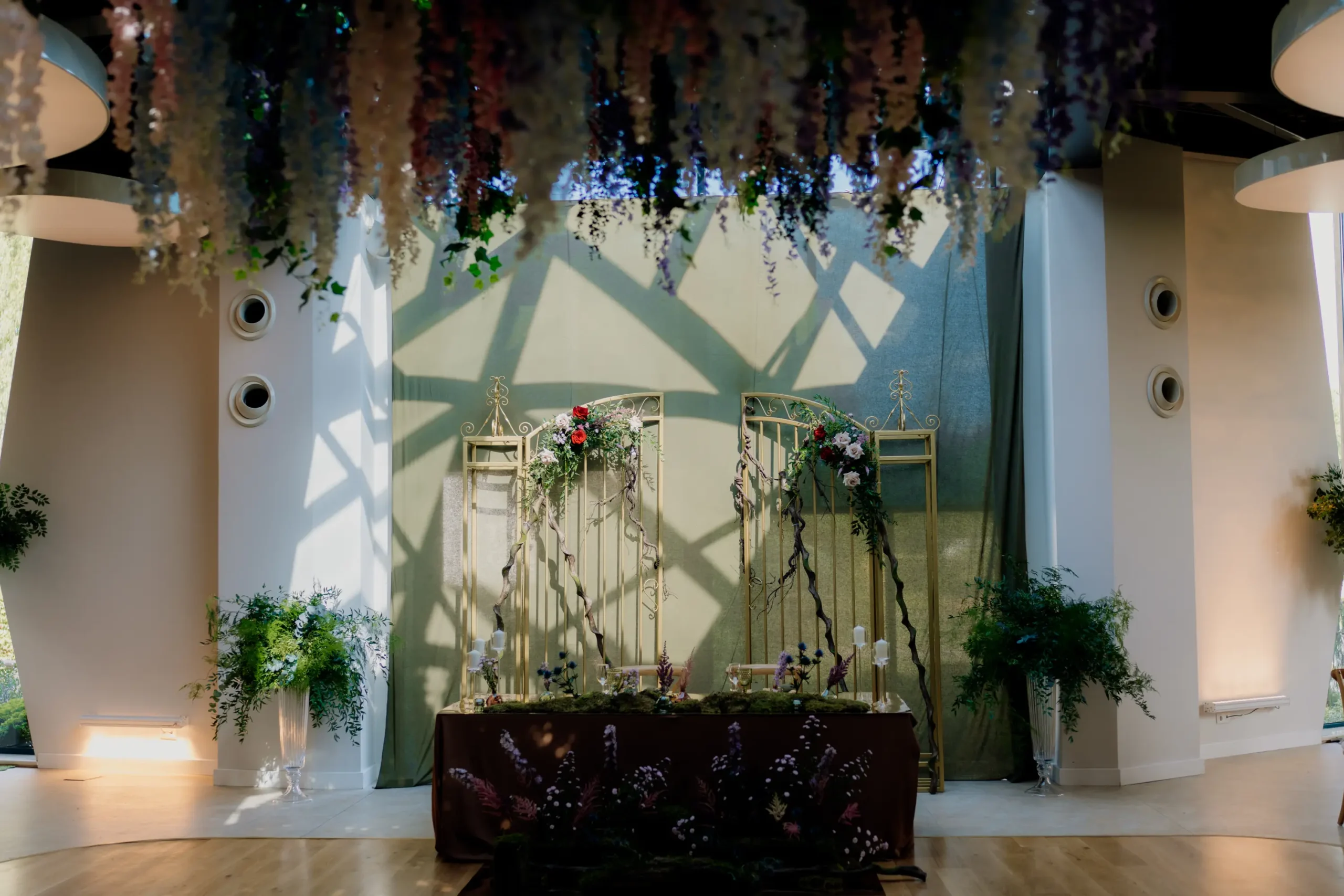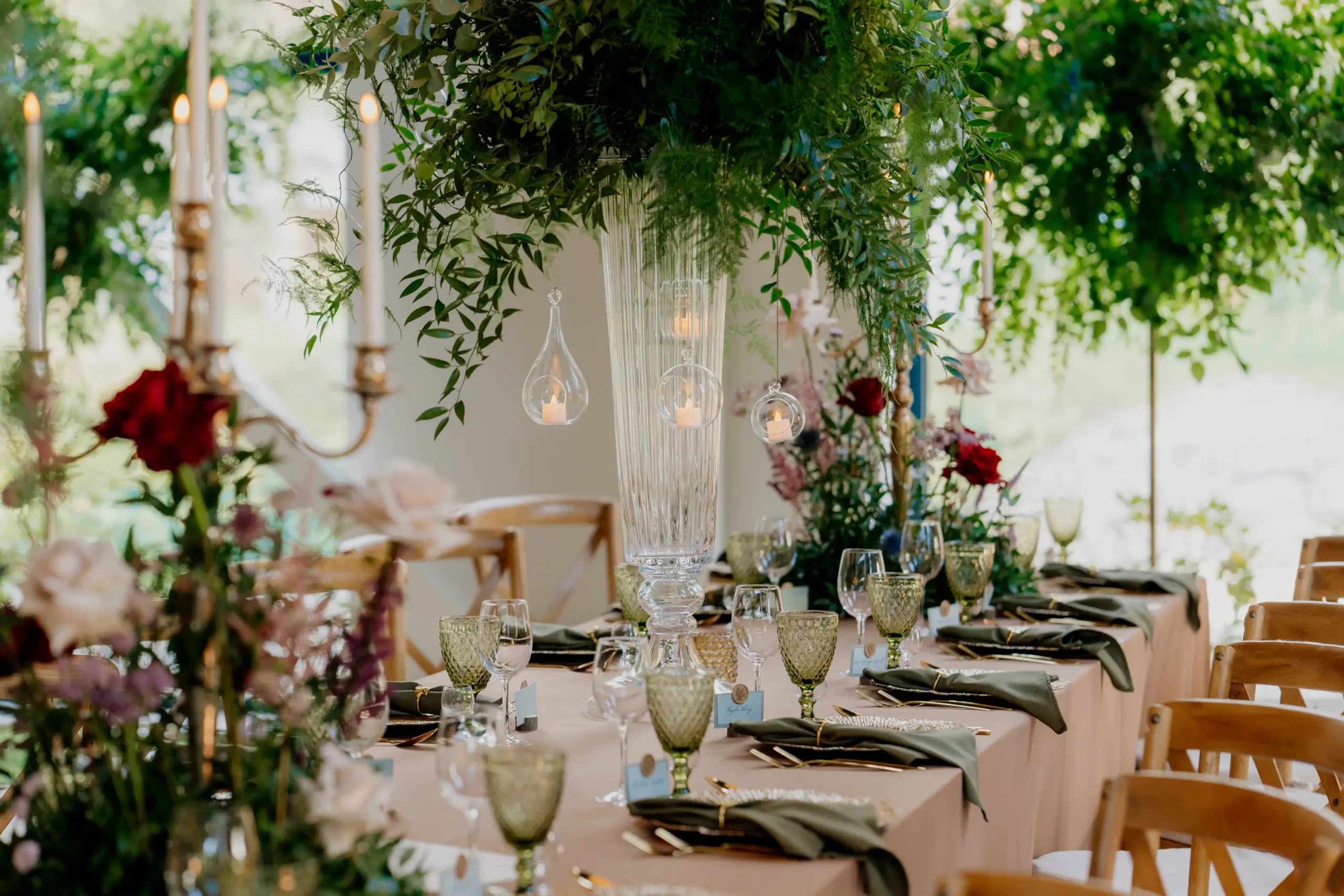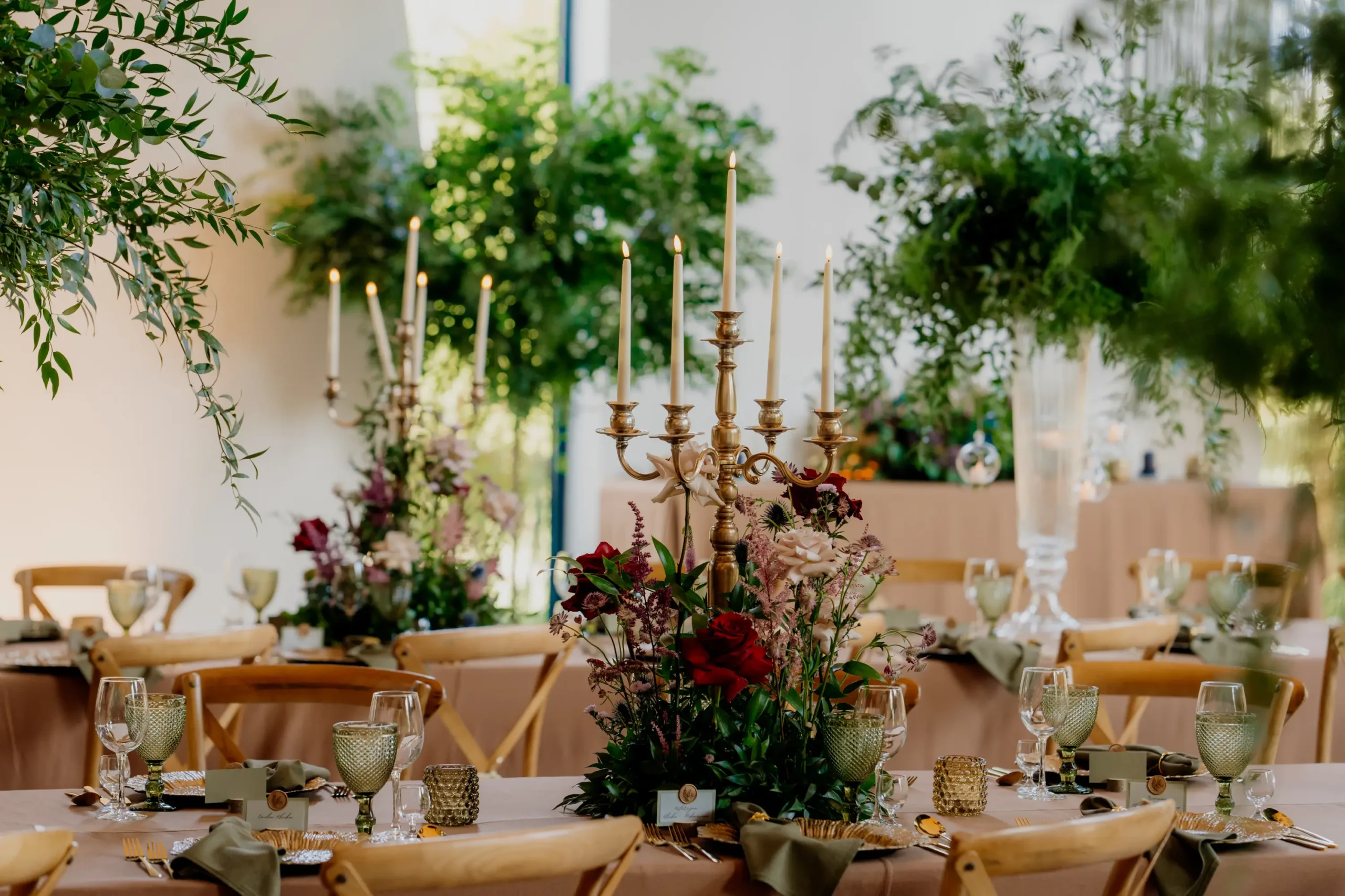 Natalia i Kuba to wyjątkowo kreatywna i artystyczna Para Młoda. Ich wesele w Młynie Smaków utrzymane było w jesiennej palecie zieleni i śliwki. Każdy stół otrzymał nieco inną aranżację kwiatową, co podkreśliło indywidualny charakter dekoracji. Jedne kompozycje swobodnie opadały, inne wznosiły się ku górze, tworząc dynamiczną i niepowtarzalną przestrzeń.