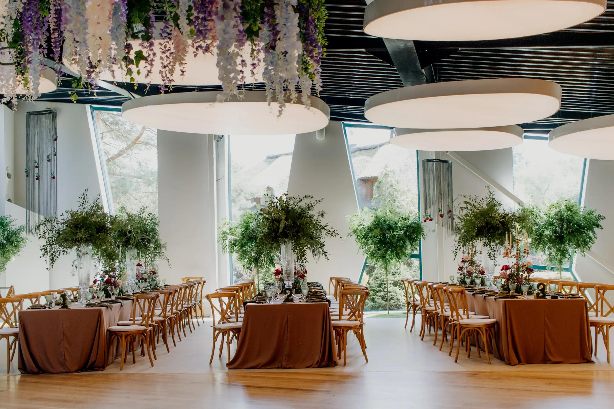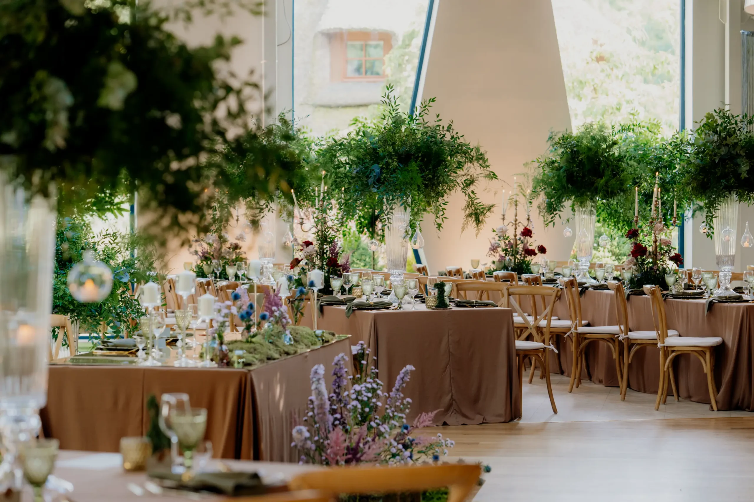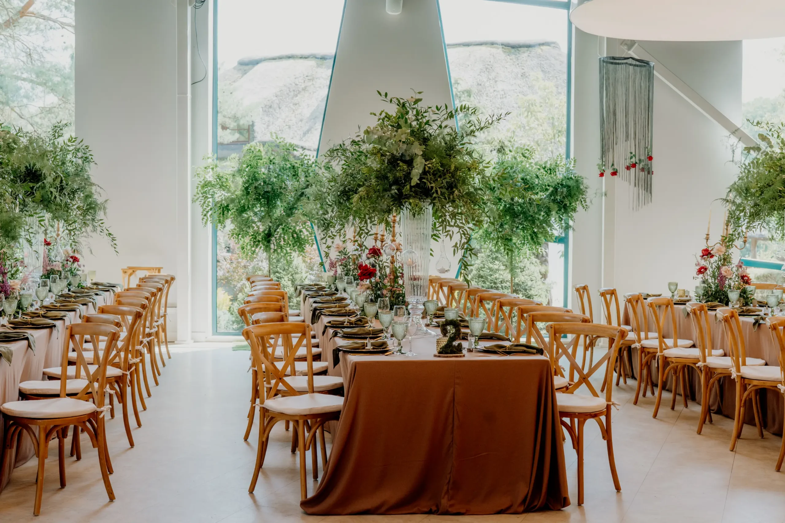 Na sali na gości czekała kolejna odsłona efektu WOW. Podwieszany sufit z kwiatów zachwycał lekkością i rozmachem, a naturalne elementy takie jak lniane obrusy oraz imponujące kompozycje przypominające drzewa na stołach gości pięknie kontrastowały z eleganckimi detalami w postaci złotych sztućców.