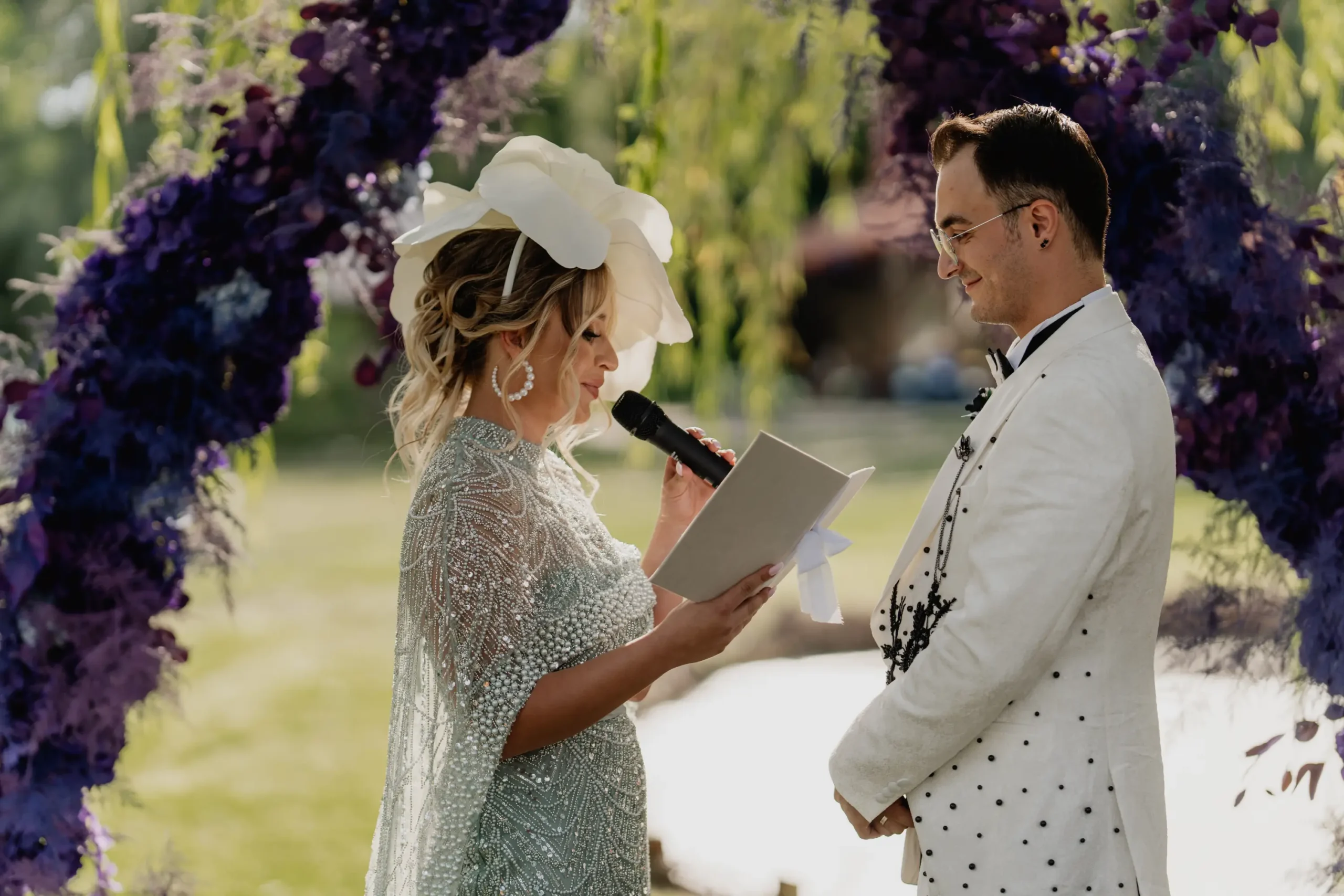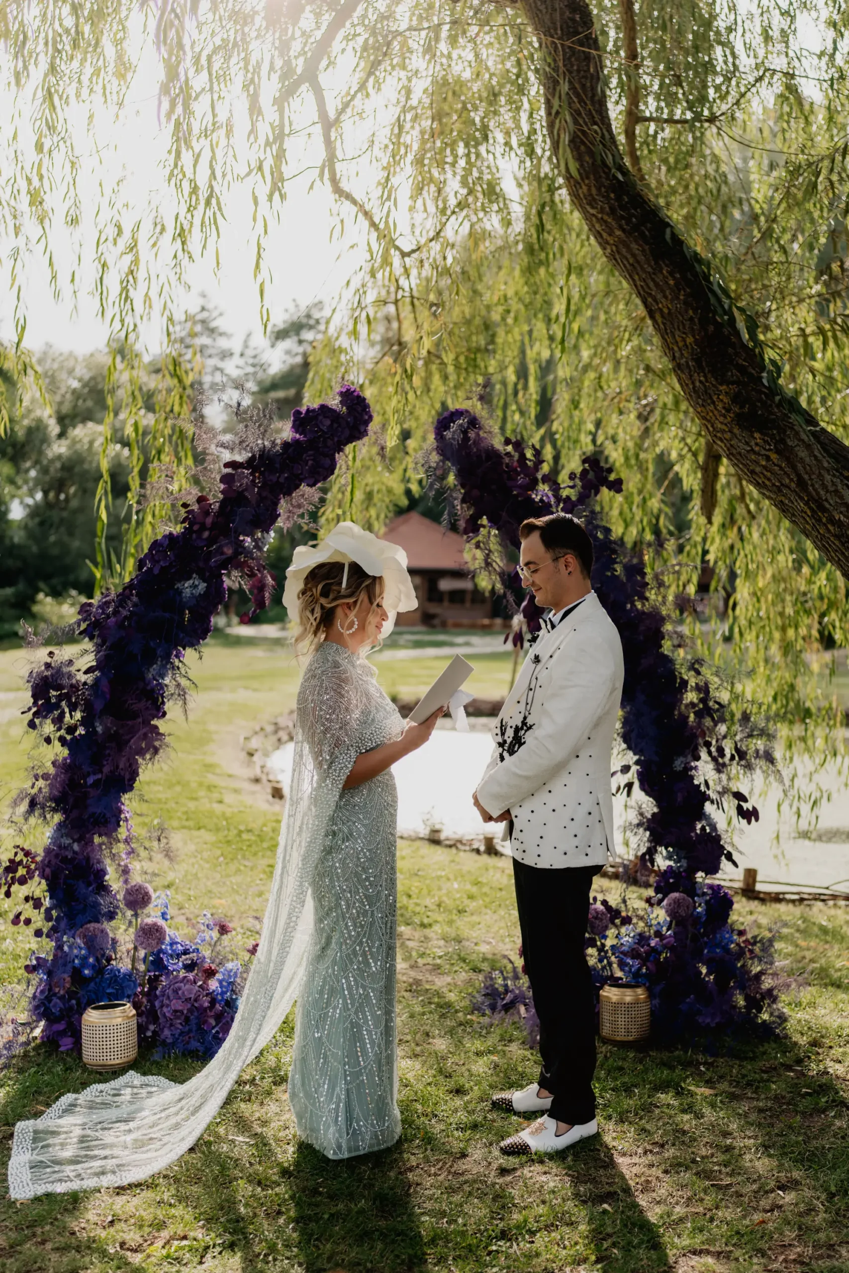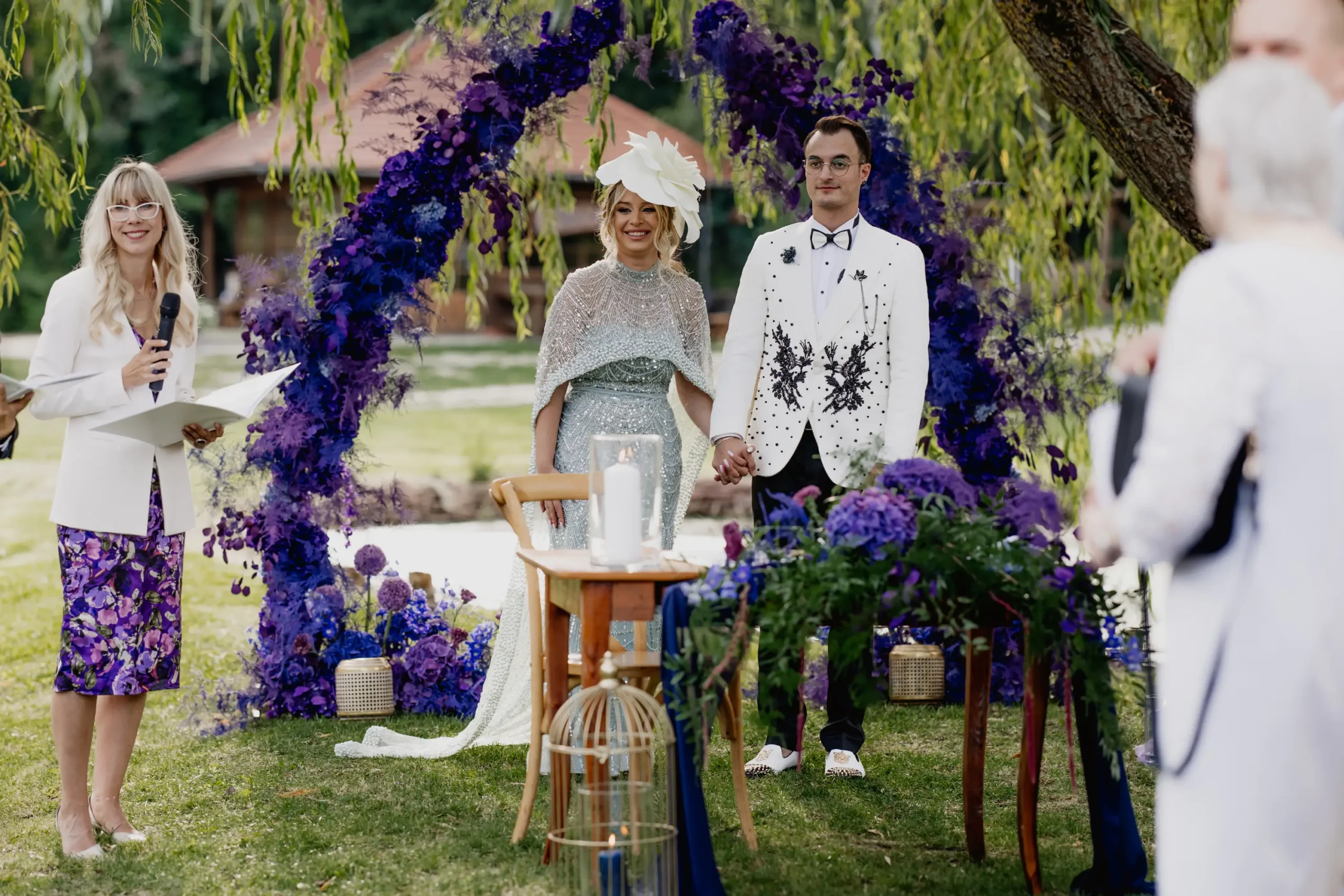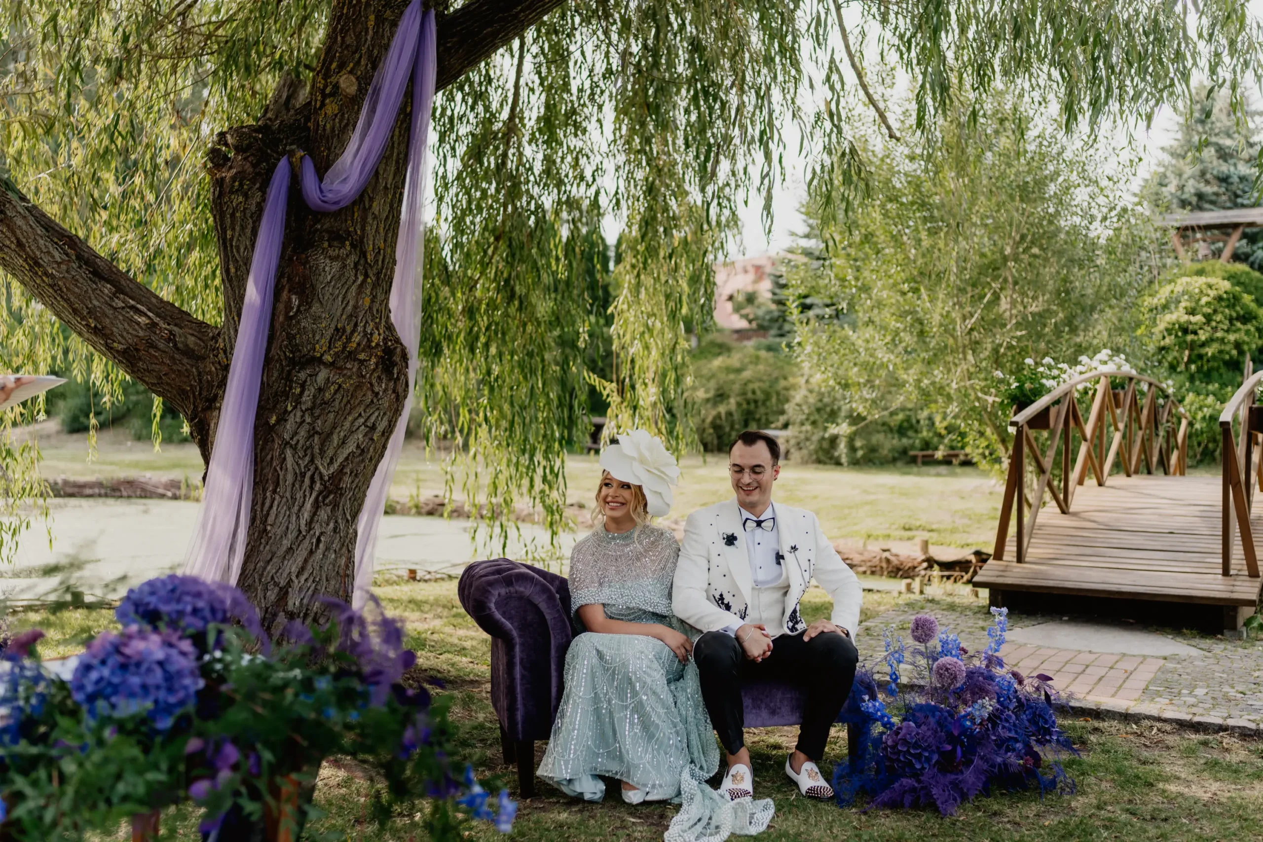 W Osadzie Karbówko mieliśmy zaszczyt stworzyć wyjątkową oprawę ceremonii oraz wesela Oliwii i Murata, naszej przesympatycznej polsko-tureckiej Pary Młodej. Było to niezwykłe przyjęcie bez bieli, utrzymane w odcieniach granatu i fioletu, pośród prawdziwego zielonego raju. Humanistyczna ceremonia pod rozłożystym drzewem zrobiła ogromne wrażenie i stała się magicznym początkiem tego dnia.