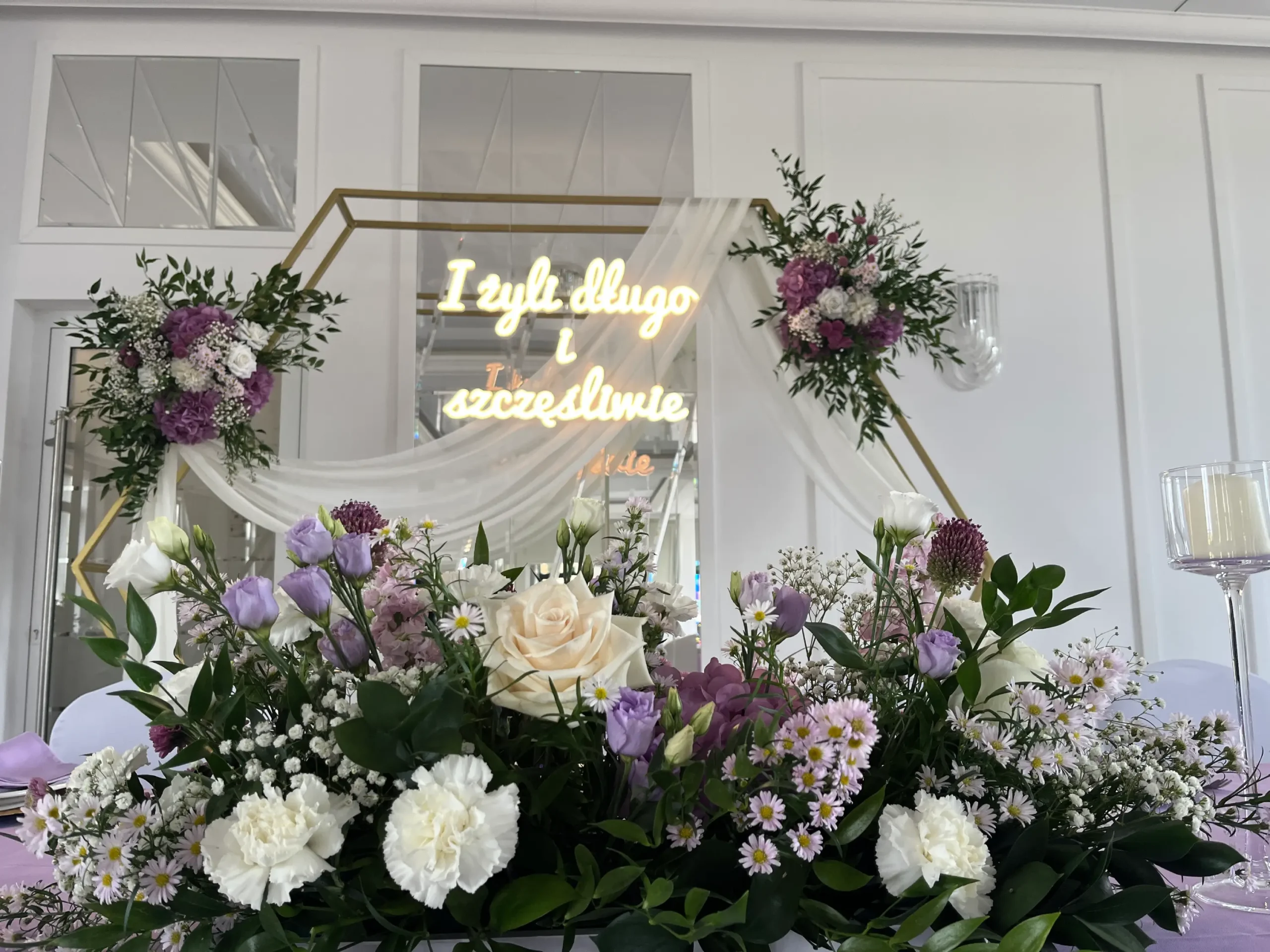 Nasza Para Młoda od samego początku wiedziała, jaki kolor musi pojawić się w dekoracjach. Lawendowy i wrzosowy, ich ulubione odcienie, stały się motywem przewodnim całej aranżacji. Niskie kompozycje kwiatowe o delikatnie polnym charakterze wprowadziły lekkość i naturalność, a subtelna ścianka za Parą Młodą dopełnia całość, tworząc romantyczne i harmonijne tło dla tego wyjątkowego dnia. Wesele odbyło się na sali Dębowy Dworek w Ciechocinku.