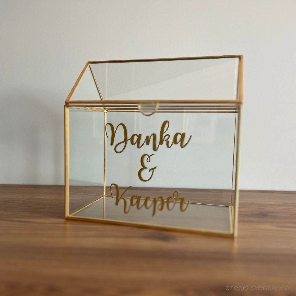 Złote pudełko na koperty z Waszym napisem personalizowanym w kolorze białym, czarnym lub złotym. Zaprojektujemy Wam wymarżone pudełko na koperty. Szklane pudełko na koperty w kształcie domku ze złotym obramowaniem. Idealna na koperty ślubne oraz po ślubie jako przepiękna dekoracja waszego domu i pamiątka Waszego ślubu.