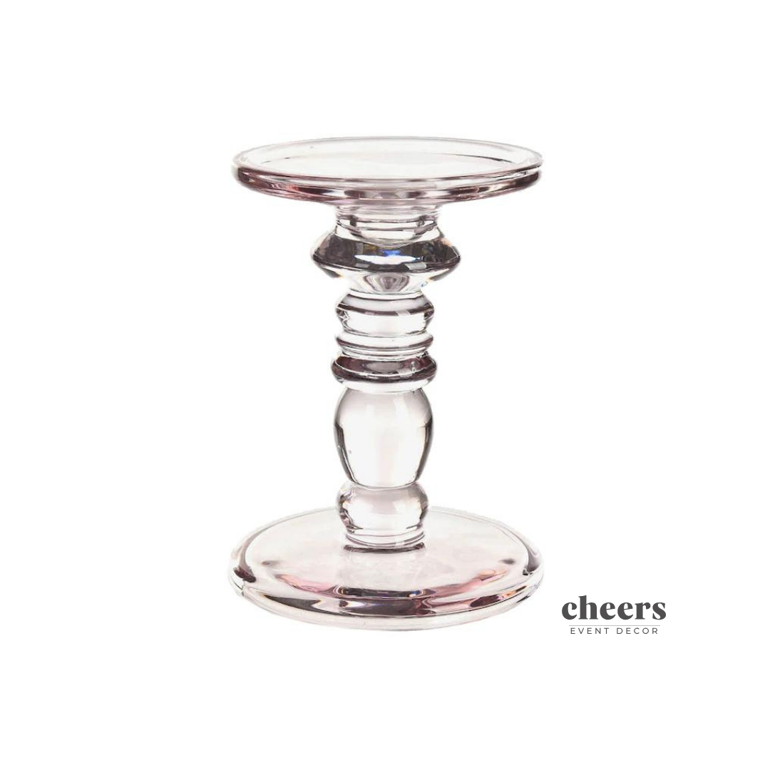 Świecznik na grubą świece ma lekko różowawy–wiśniowy kolor szkła.